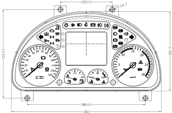 细化仪表水温刻度显示、增大白色区域、减小红色区域。1)匹配玉柴、潍柴发动机:当水温≤95℃时,按实际温度显示;当水温在95℃~107℃区间时一直按98℃固定位置显示;当水温≥108℃时指针匀速移动指示到红色区域并点亮水温过高报警指示灯,按实际值温度显示。