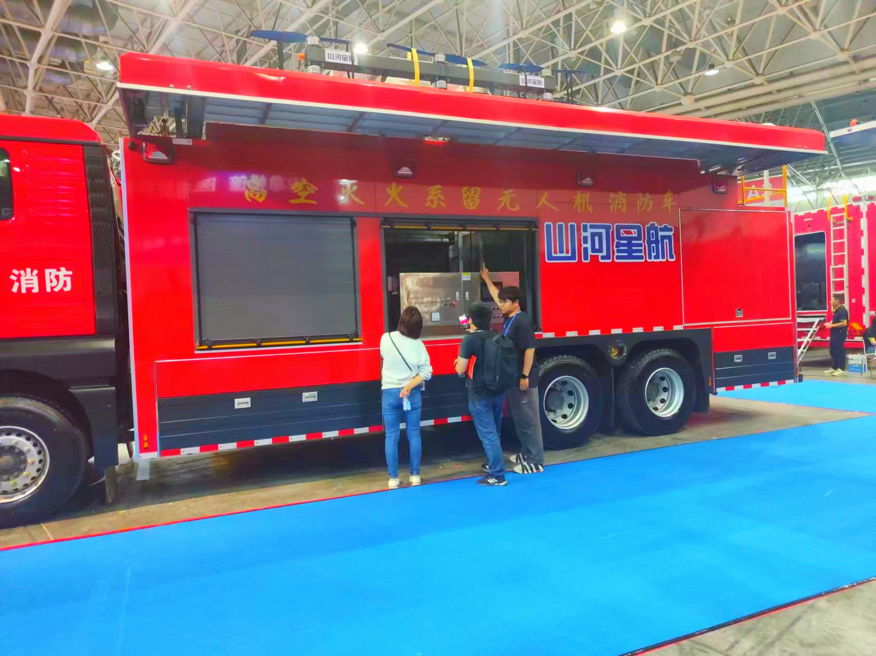 图为3044永利工作人员介绍高空系留无人机消防车